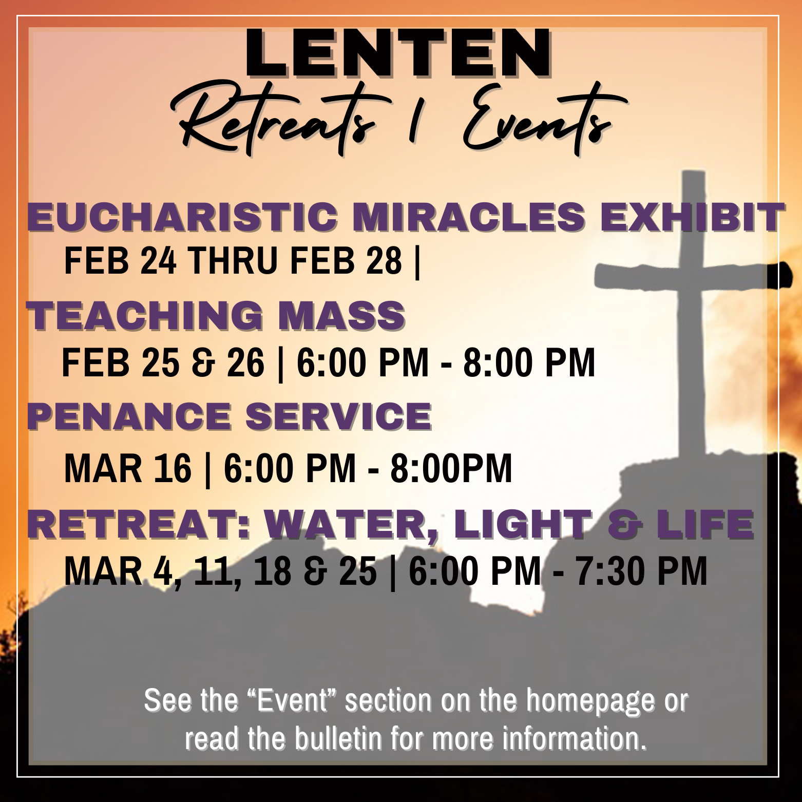 Parents and Sponsors may attend one of the various retreats held during Lent to meet the requirement. Please contact the appropriate Ministry Director for more information.